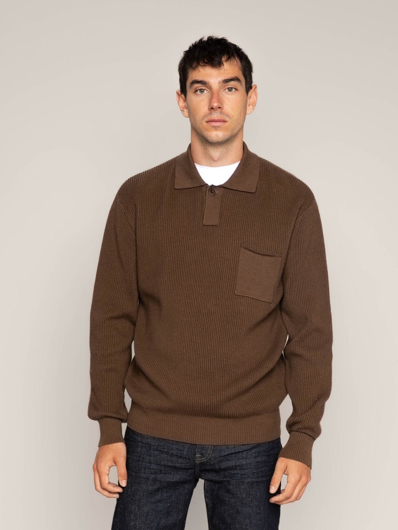 Long sleeve rib knitted polo, spun from cotton, wool, and pillow-soft cashmere. Finished with buttoned placket, front pocket, and contrast stripes at cuffs. Pair with a workwear inspired jacket and cargo pants.