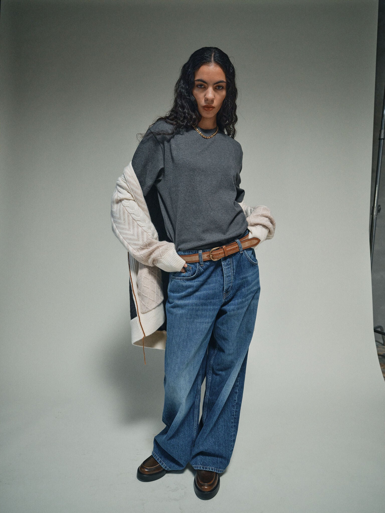 Drapierte Denim-Jeans mit weitem Bein und niedriger Taille – ein lässiger Schnitt, der cool an der Hüfte hängt. Die gedrehte Seitennaht verleiht ein verspieltes Element und bricht das klassische Design. Casual-Jeans mit Attitüde.