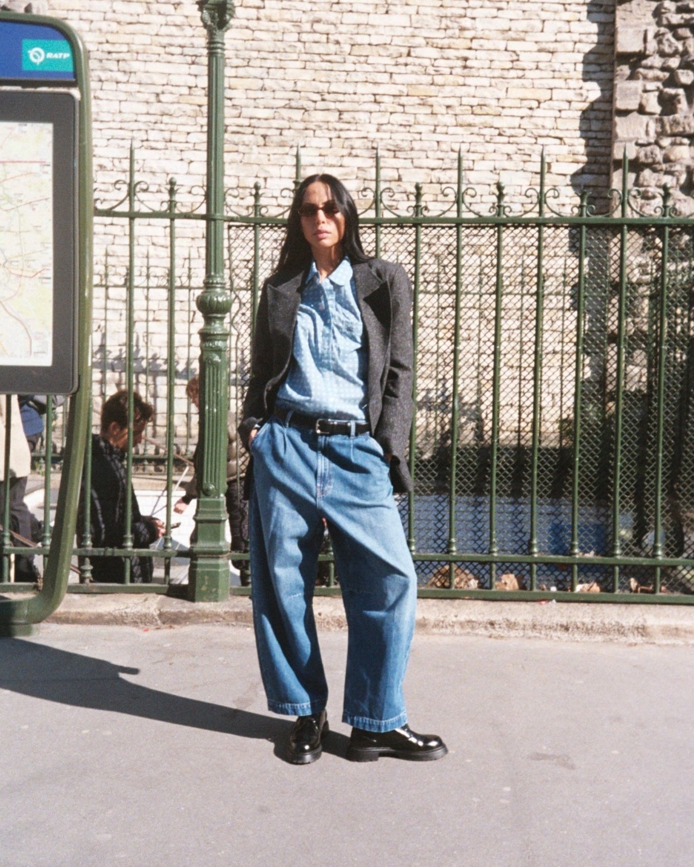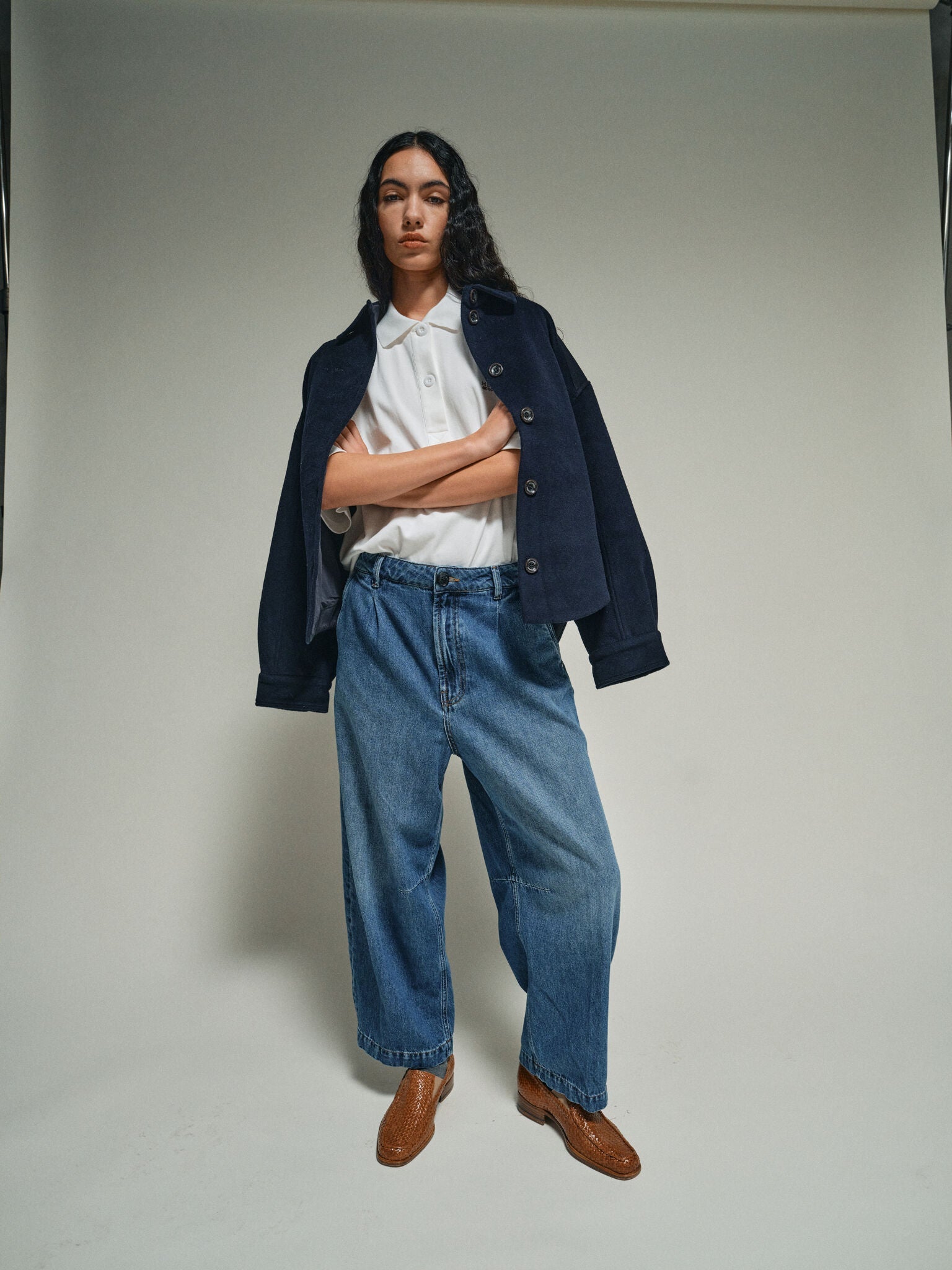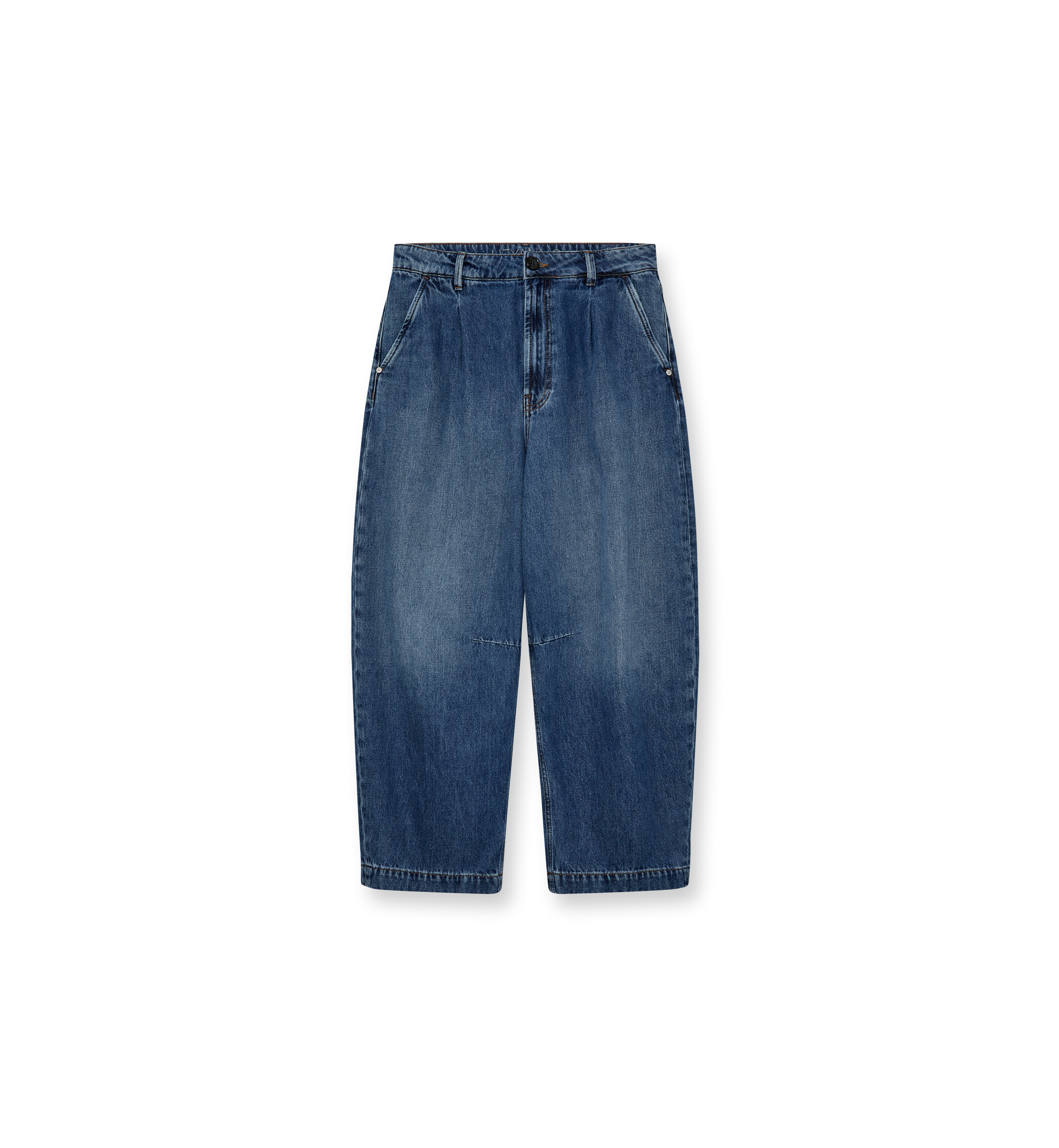 Jeans mit weitem Bein und niedriger Taille, gefertigt aus weichem, drapiertem Denim. Der schwarze Knopf und die dunklen Waschdetails verleihen eine rauhe Optik und zusätzliche Tiefe.
