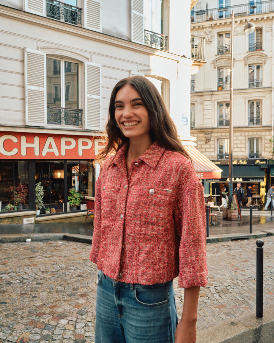 Mit dieser schicken Bouclé-Jacke in kastenförmiger, taillierter Passform verleihst du deinem Outfit den letzten Schliff. Kurze Ärmel, große Brusttaschen und luxuriöse Goldknöpfe verleihen ihr einen Hauch von Raffinesse. Du kannst sie mit einer Jeans mit weitem Bein und hoher Taille für einen unkomplizierten, eleganten Look kombinieren.