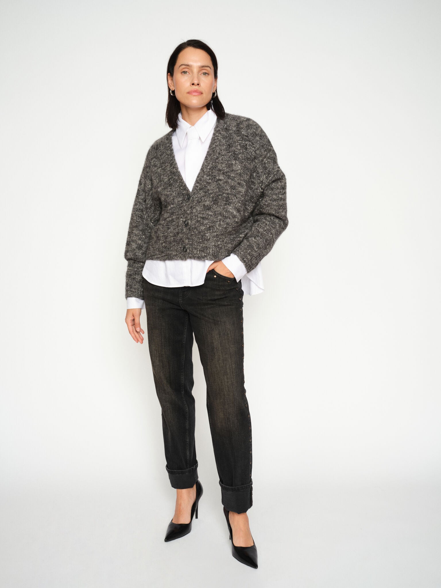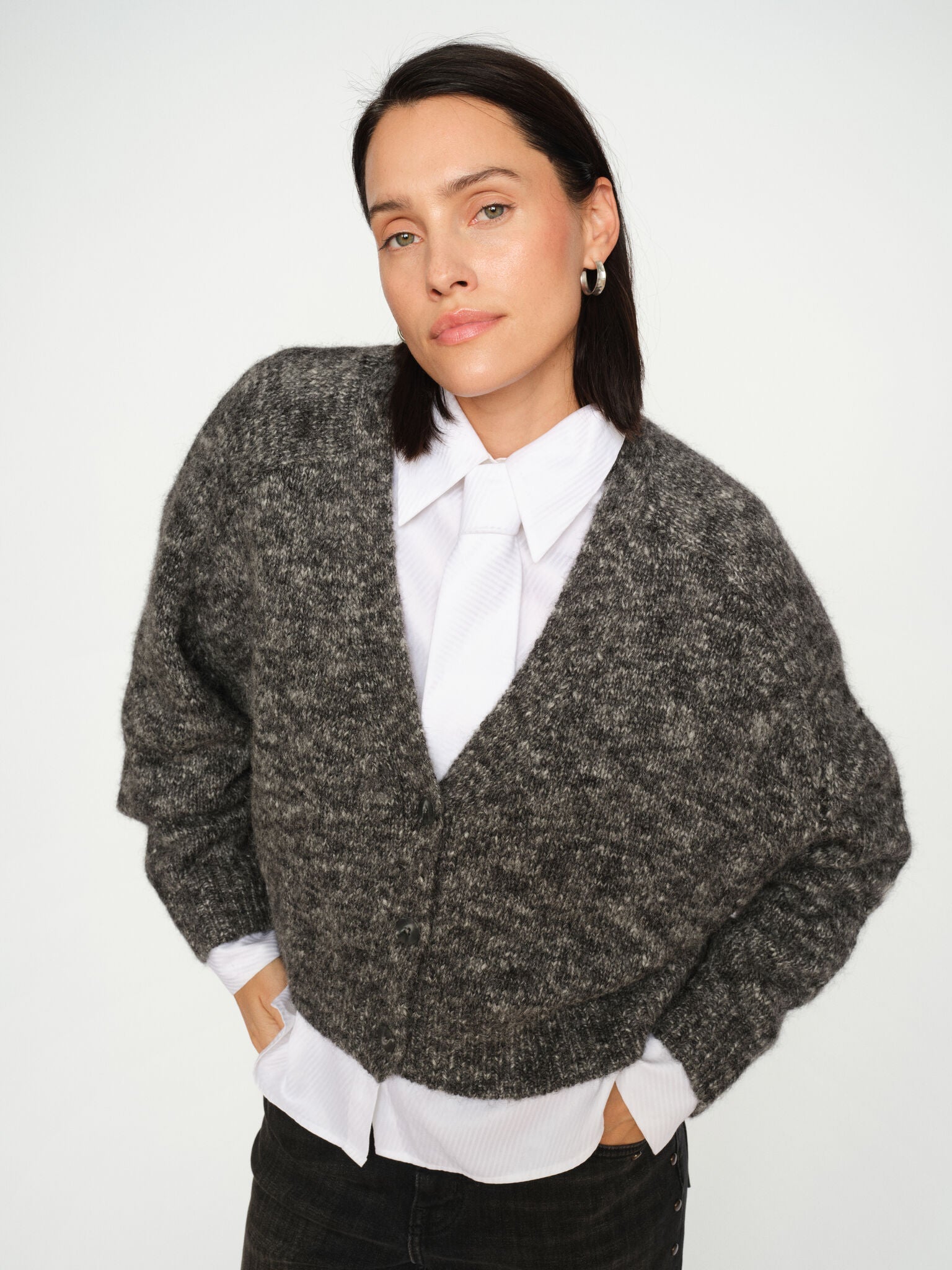 Diese oversized Strickjacke aus einer weichen Wollmischung steht für gemütlichen Komfort und zeitlose Vielseitigkeit. Mit klassischem V-Ausschnitt und feinen Rippabschlüssen ist sie das perfekte Layering-Piece für kalte Tage. Trage sie über einem Rollkragenpullover für extra Wärme oder kombiniere sie mit Denim für einen entspannten, dennoch stilvollen Look.